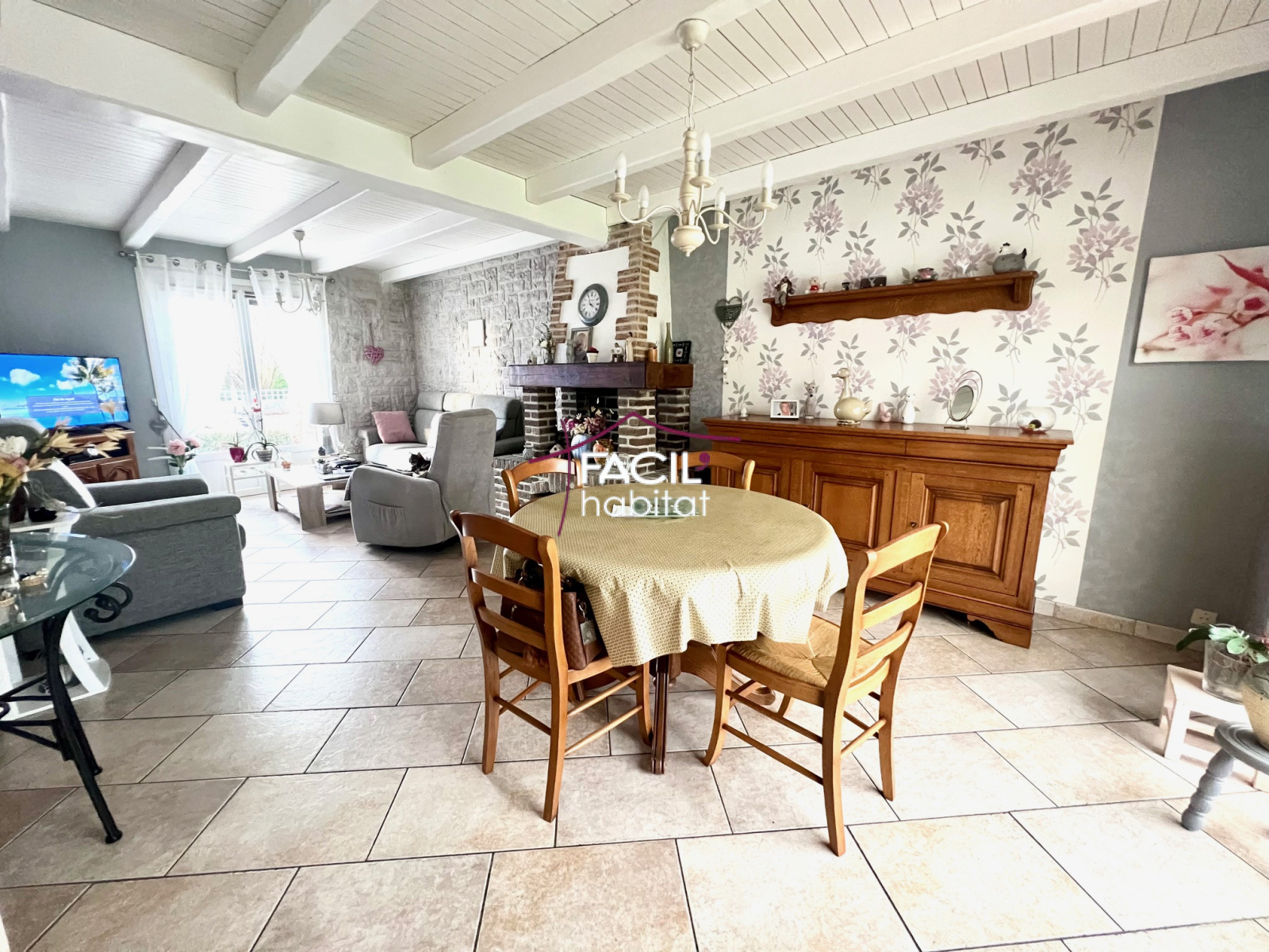 L'espace intérieur compte un hall d'entrée, un double séjour, une cuisine équipée, ainsi que 3 chambres et sdb à l'étage.