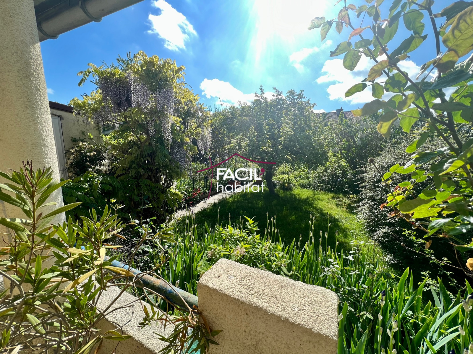 Pergola, dépendances, beau jardin clos fleuri et bien exposé, garage, parking.